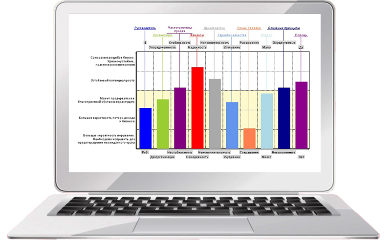 График результатов компании. Подробное описание каждой точки, сильных и слабых сторон бизнеса.